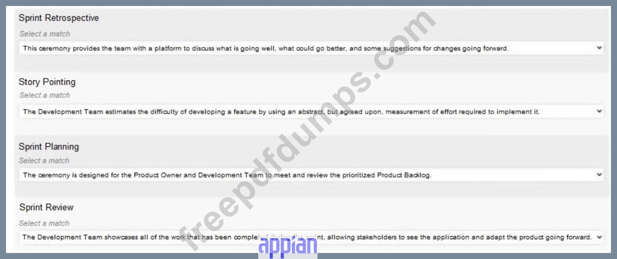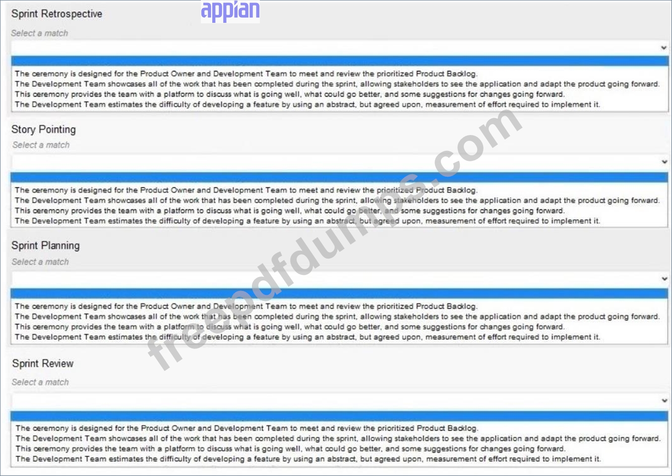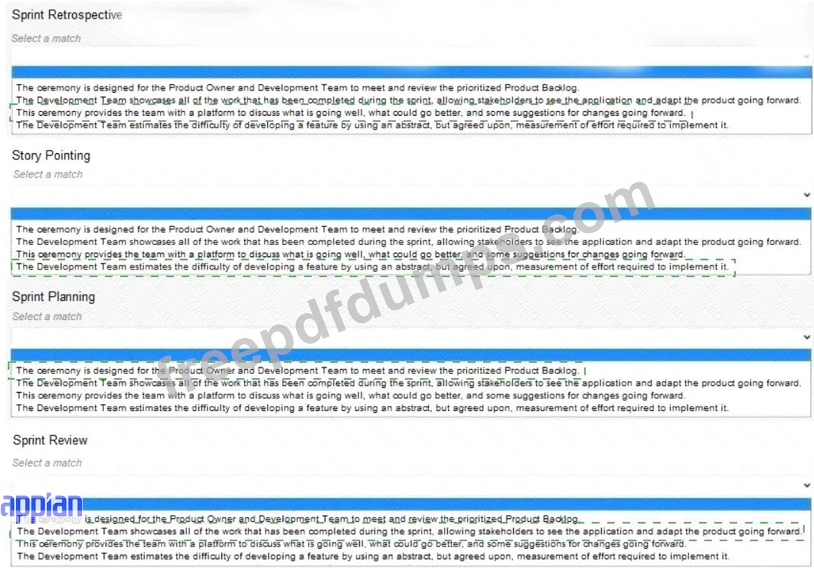 Match each sprint ceremony to its appropriate objective. Each objective may be used once, more than once, or not at all.