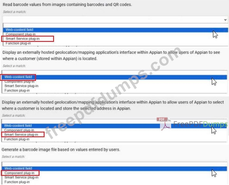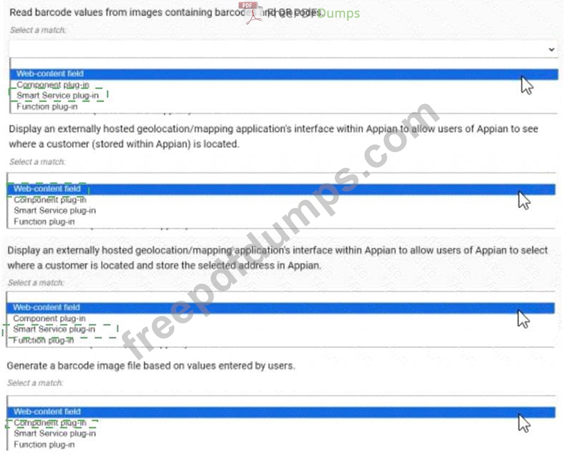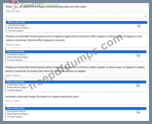 Requirement: Display an externally hosted geolocation mapping applications interface within Appian to allow users of Appian to select where a customer is located and store the selected address in Appian. Correct approach: A. Web-content field and C. Smart Service plug-in Exact explanation of correct approach taken from Appian Documentation: A web-content field and a smart service plug-in would be suitable for displaying an externally hosted geolocation mapping applications interface within Appian to allow users of Appian to select where a customer is located and store the selected address in Appian. A web-content field would be suitable for displaying the external geolocation mapping applications interface, as explained above. A smart service plug-in would be suitable for storing the selected address in Appian, as it can use Java code to receive the address data from the web content, validate it, and write it to a data store entity or a process variable.