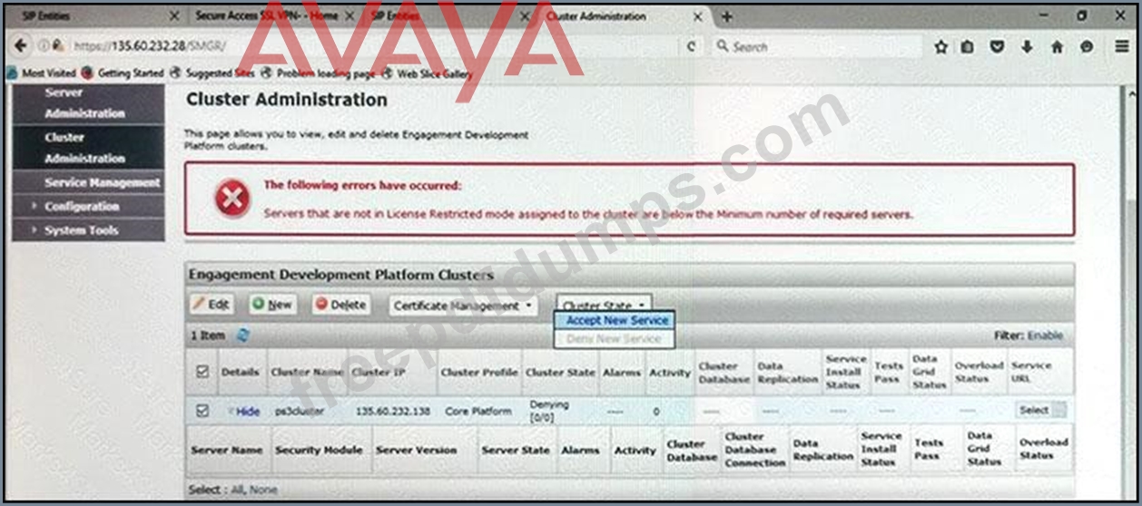 In the Cluster Administration screen of a PresenceServices cluster, when you try to change the cluster state to Accept New Service, you receive the error:
