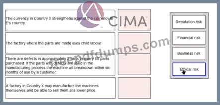E purchases parts for one of the machines it manufactures from Country X Place the risk classification next to the risk it relates to: