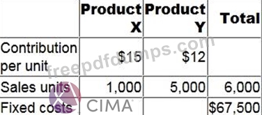 What are the total fixed costs when the weighted average contribution per unit is $5 and the breakeven points for product A and product B are 10,000 units and 5,000 units respectively?