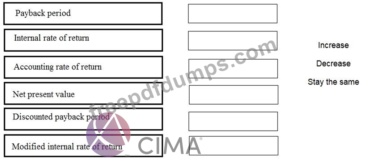 An investment appraisal has identified that a project has a positive net present value when discounted at the company's cost of capital. If the cost of capital is now increased, indicate whether each of the following appraisal measures will increase, decrease or stay the same.