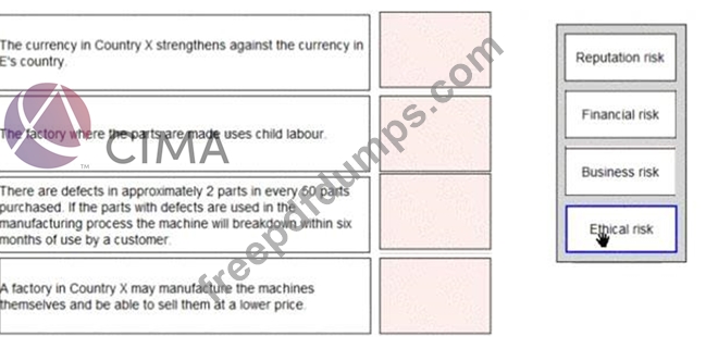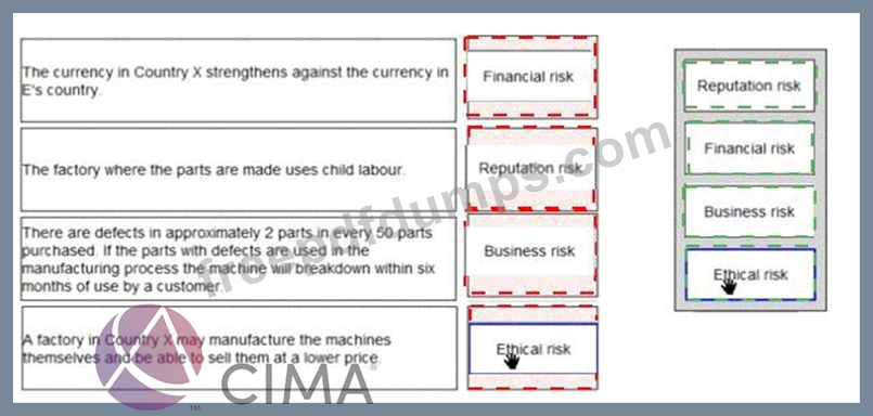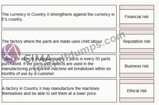 E purchases parts for one of the machines it manufactures from Country X Place the risk classification next to the risk it relates to: