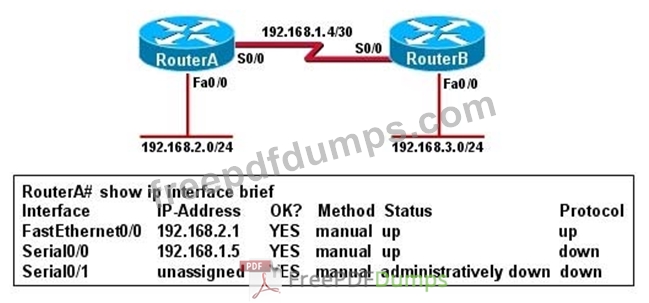 Hosts in network 192.168.2.0 are unable to reach hosts in network 192.168.3.0. Based on the output from RouterA, what are two possible reasons for the failure? (Choose two.)