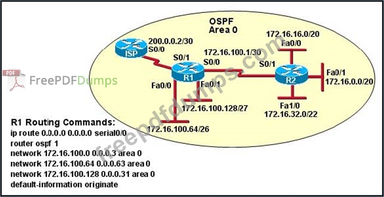 Assume that all router interfaces are operational and correctly configured. In addition, assume that OSPF has been correctly configured on router R2. How will the default route configured on R1 affect the operation of R2?