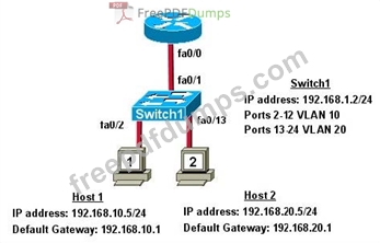 What commands must be configured on the 2950 switch and the router to allow communication between host 1 and host 2? (Choose two.)