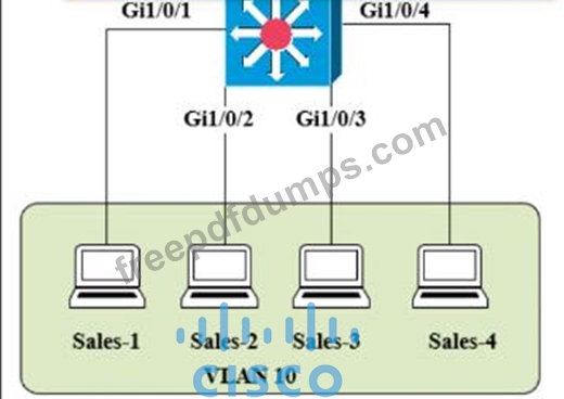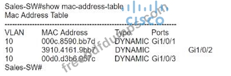 The entire contents of the MAC address table are shown. Sales-4 sends a data frame to Sales-1.