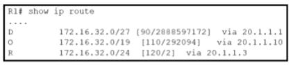 Router R1 is running three different routing protocols. Which route characteristic is used by the router to forward the packet that it receives for destination IP 172.16.32.1?