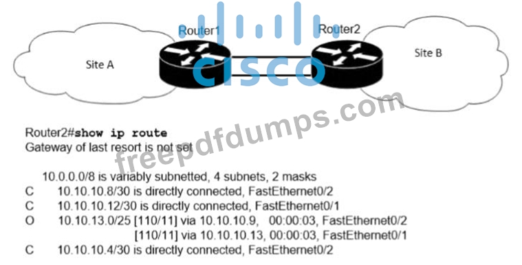 If OSPF Is running on this network, how does Router2 handle traffic from Site B to 10.10.13.128/25 at Site A?