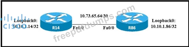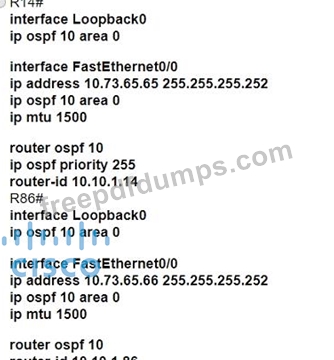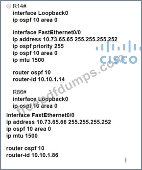 All interfaces are configured with duplex auto and ip ospf network broadcast. Which configuration allows routers R14 and R86 to form an OSPFv2 adjacency and act as a central point for exchanging OSPF information between routers?