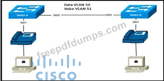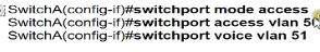 Switch A is newly configured. All VLANs are present in the VLAN database. The IP phone and PC A on Gi0/1 must be configured for the appropriate VLANs to establish connectivity between the PCs. Which command set fulfills the requirement?