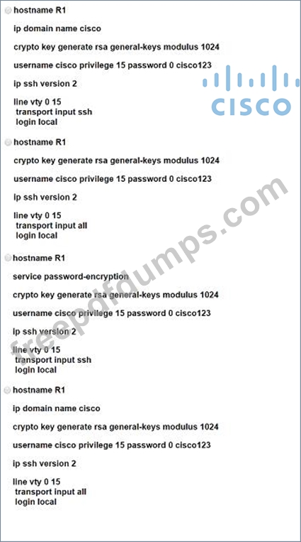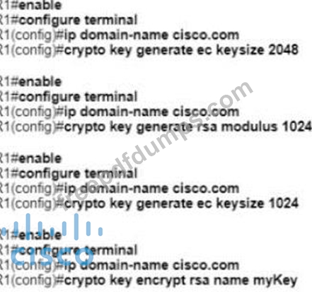 A network administrator must to configure SSH for remote access to router R1 The requirement is to use a public and private key pair to encrypt management traffic to and from the connecting client.