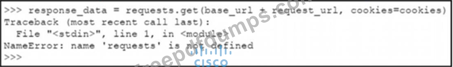 A Python code has been written to query a device. The executed code results in the error shown. Which action resolves the problem?