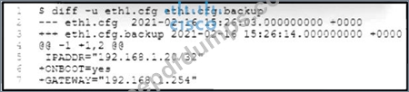 Refer to the exhibit. A network engineer changes the configuration of a device interface, and the device becomes unreachable. The engineer accesses the server console to review the differences with the backup file. Which change must be made in the eth1.cfg file to restore the original configuration?