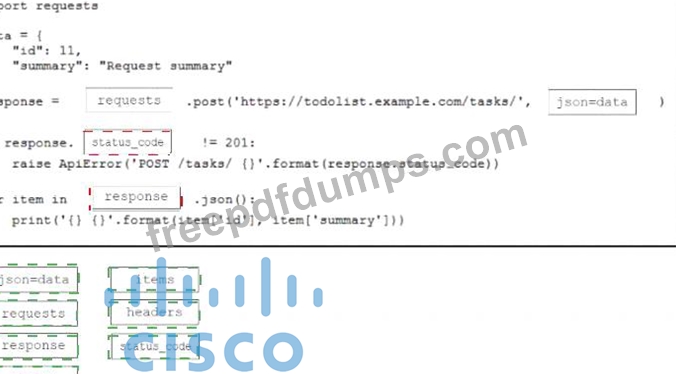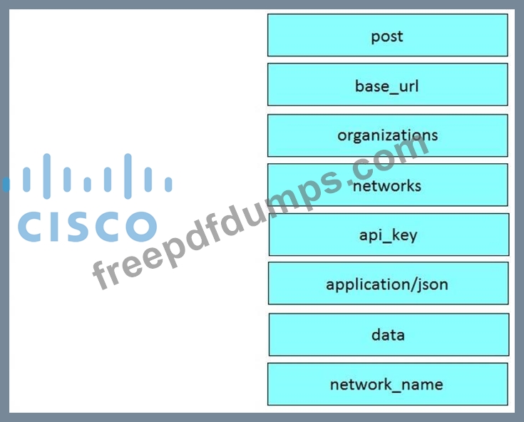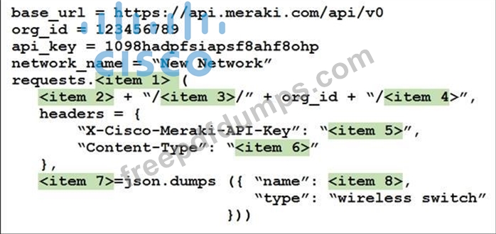 Drag and drop the code from the left onto the item numbers on the right to complete to Meraki python script shown in the exhibit.