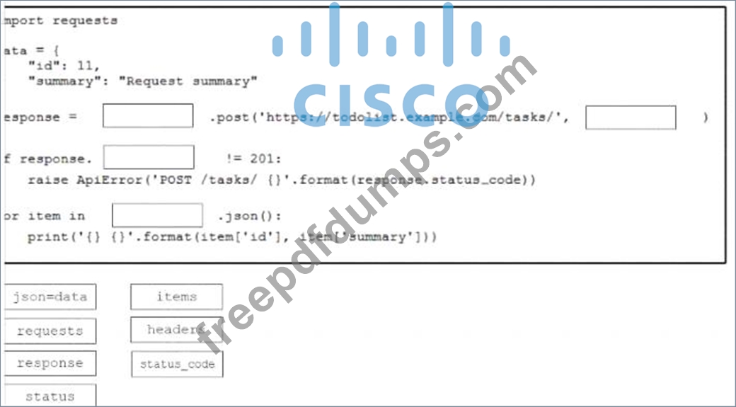 Drag and drop the code from the bottom onto the box where the code is missing to construct a Python script that calls a REST API request. Not all options are used.
