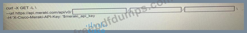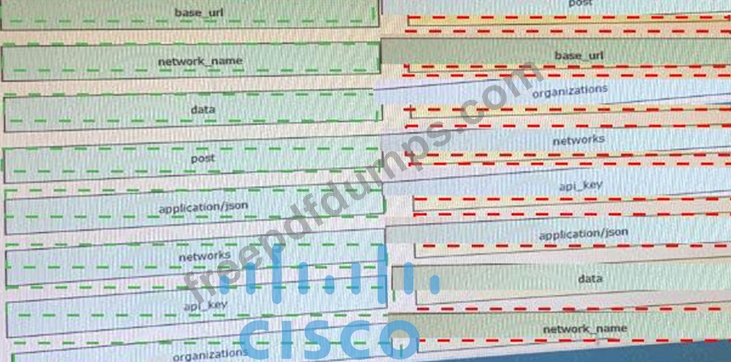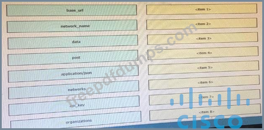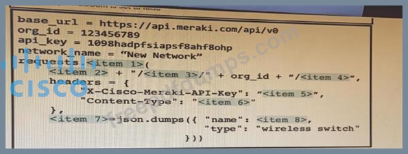Drag and drop the code from the left onto the item numbers on the right to complete to Meraki python script shown in the exhibit.