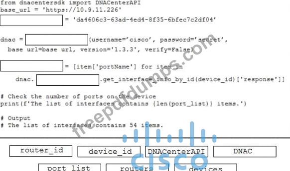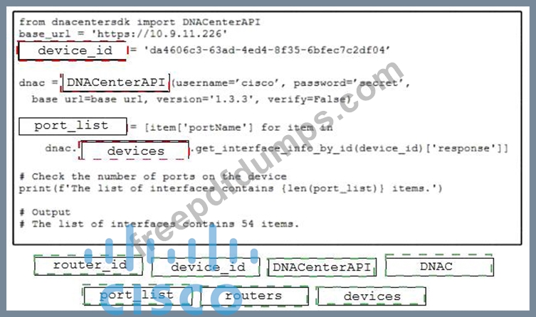 Refer to the exhibit. Drag and drop the code from the bottom onto the box where the code is missing to return the number of interfaces on a network device by using the Cisco DNA Center SDK. Not all options are used.