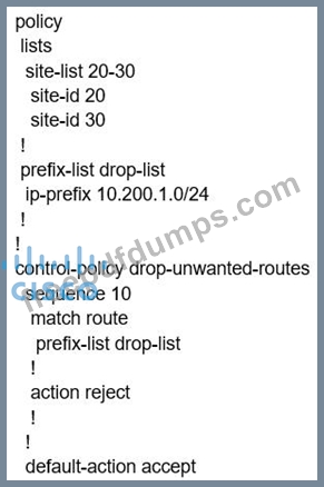 When the VPN membership policy is being controlled at the vSmart controller, which policy disallows VPN 1 at sites 20 and 30?