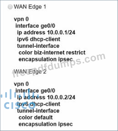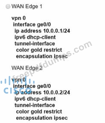 An engineer must configure two branch WAN Edge devices where an Internet connection is available and the controllers are in the headquarters. The requirement is to have IPsec VPN tunnels established between the same colors. Which configuration meets the requirement on both WAN Edge devices?