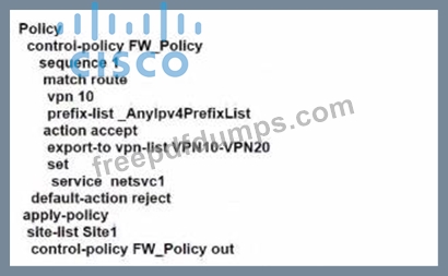 Refer to the exhibit. A customer wants to deploy service insertion at site1. Which traffic from VPN 10 must route to this site through a firewall. A policy must be in place to route VPN 10 traffic from all sites toward this firewall. Which configuration must be on the vSmart controller to meet this requirement?