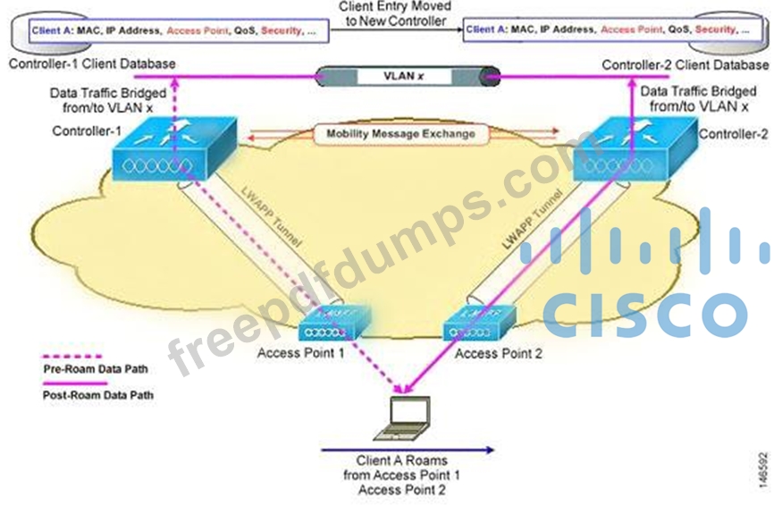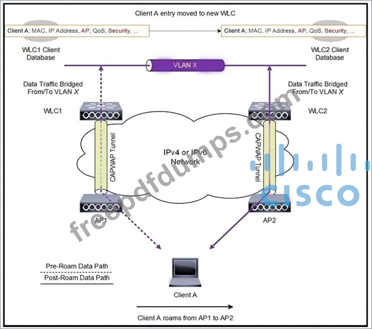 A client roams between two APs that are registered to two different controllers, where each controller has an interface in the client subnet. Both controllers are running AireOS. Which scenario explains the client roaming behavior?
