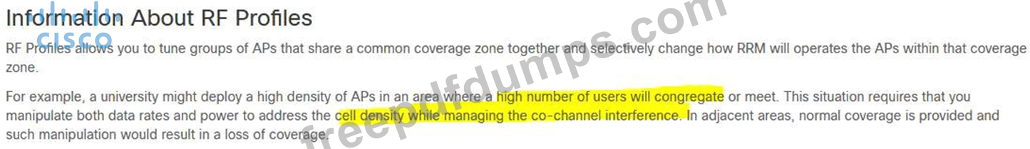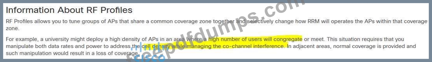 An engineer has deployed a group of APs in an auditorium and notices that the APs are showing high cochannel interference. Which profile can be used to adjust the parameters for these high- density APs?