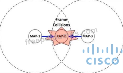 Refer to the exhibit. During a post Mesh deployment survey, an engineer notices that frame collisions occur when MAP-1 and MAP-3 talk to RAP-2 Which type of issue does the engineer need to address in the design?