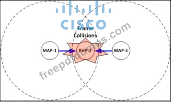 Refer to the exhibit. During a post Mesh deployment survey, an engineer notices that frame collisions occur when MAP-1 and MAP-3 talk to RAP-2 Which type of issue does the engineer need to address in the design?