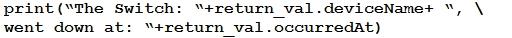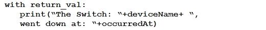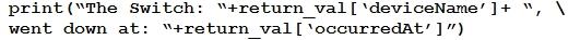 Refer to the exhibit. The task is to create a Python script to display an alert message when a Meraki MX Security Appliance goes down. The exhibit shows sample data that is received.