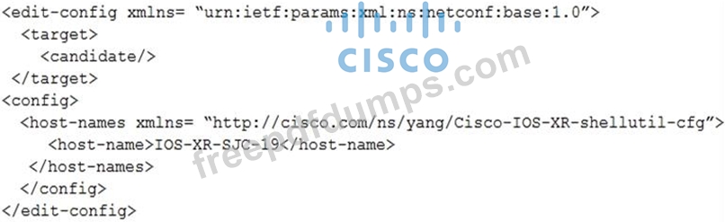 Refer to the exhibit. After this operation, what else is needed to change the hostname of the router to IOS-XR-SJC-19?