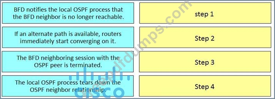 A failure occurs on the network between two BFD and OSPF neighbors. Drag and drop the protocol actions from the left into the correct order on the right.