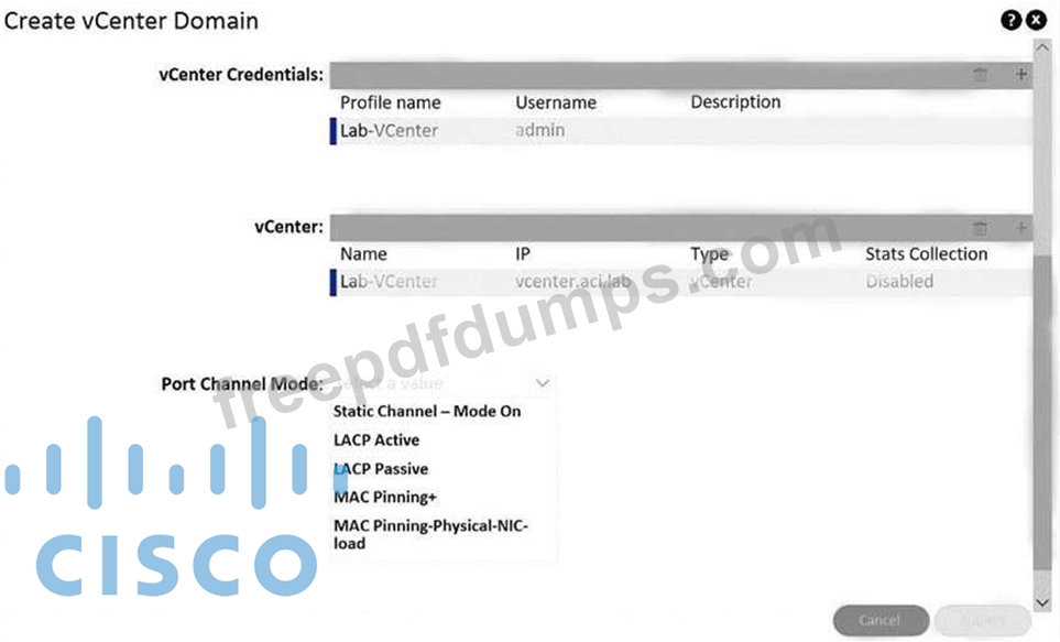 An engineer is implementing Cisco ACI - VMware vCenter integration for a blade server that lacks support of bonding. Which port channel mode results in "route based on originating virtual port" on the VMware VDS?