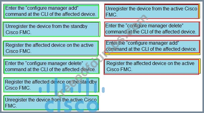 Drag and drop the steps to restore an automatic device registration failure on the standby Cisco FMC from the left into the correct order on the right. Not all options are used.