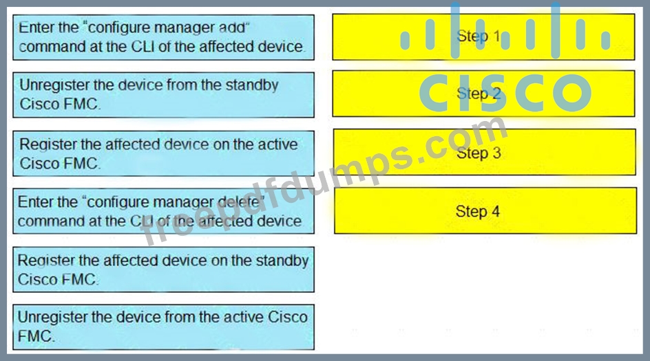 Drag and drop the steps to restore an automatic device registration failure on the standby Cisco FMC from the left into the correct order on the right. Not all options are used.