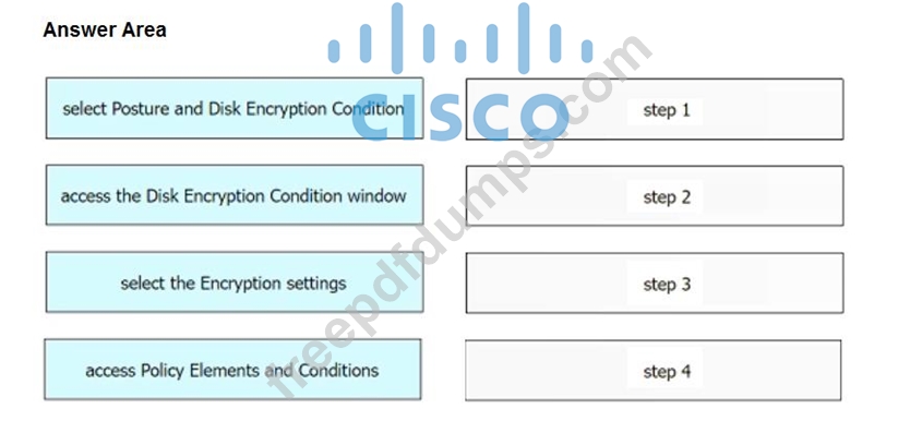 An engineer needs to configure a compliance policy on Cisco ISE to ensure that the latest encryption software is running on the C drive of all endpoints. Drag and drop the configuration steps from the left into the sequence on the right to accomplish this task.