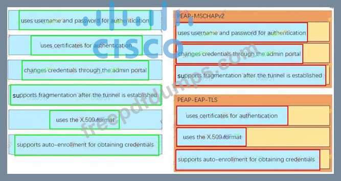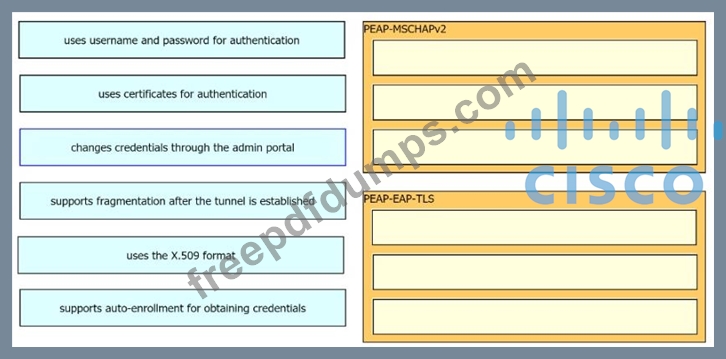 An organization wants to implement 802.1X and is debating whether to use PEAP-MSCHAPv2 or PEAP-EAP-TLS for authentication. Drag the characteristics on the left to the corresponding protocol on the right.