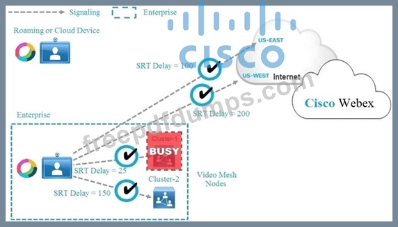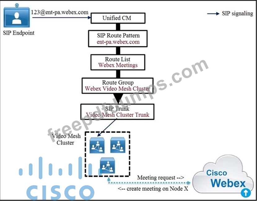 Cisco Unified Communications Manager routes the call via the Webex Meetings route list and route group to the Video Mesh cluster Node#1 in the Video Mesh cluster is hosting the meeting and has reached full capacity, but other nodes in the cluster still have spare capacity.