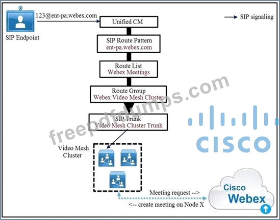 Cisco Unified Communications Manager routes the call via the Webex Meetings route list and route group to the Video Mesh cluster Node#1 in the Video Mesh cluster is hosting the meeting and has reached full capacity, but other nodes in the cluster still have spare capacity.