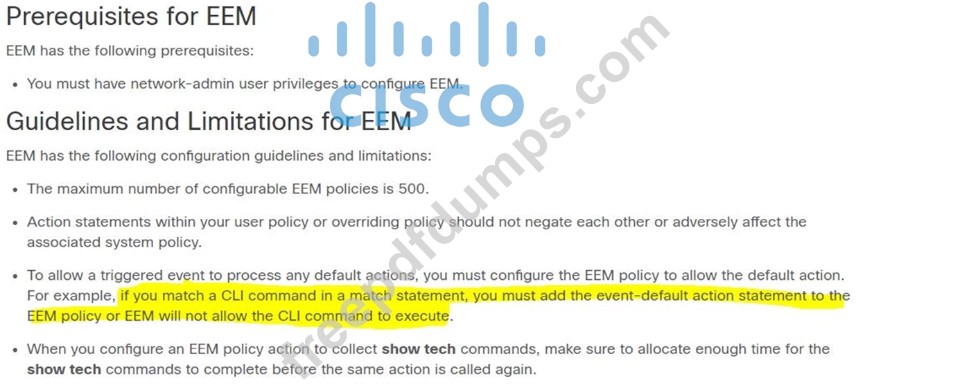 AN engineer enters these commands while in EEM on a Cisco Nexus 9000 Series Switch.