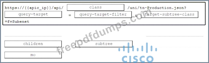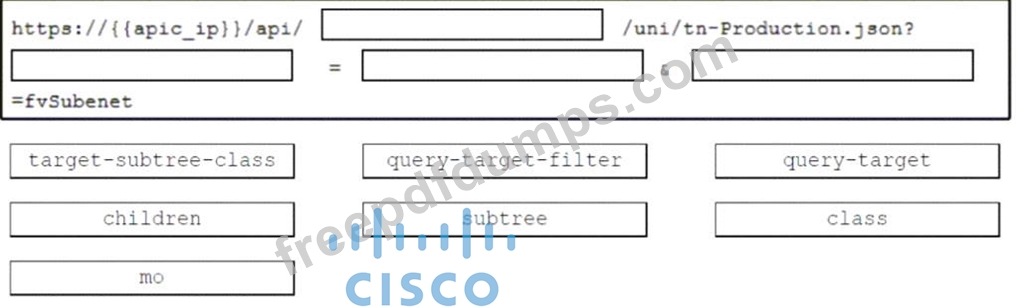 Drag and drop the keywords onto the URL request to collect all the subnets configured under tenant Production using a REST API. Not all options are used.
