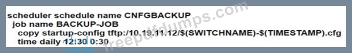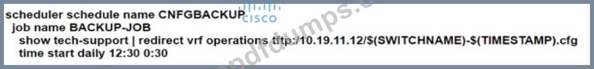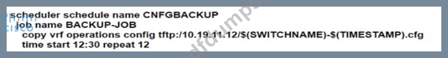 An engineer must create a scheduler configuration to create two backup jobs per day. The backup file must be copied to a server in the operations VRF. Which configuration accomplishes this task?