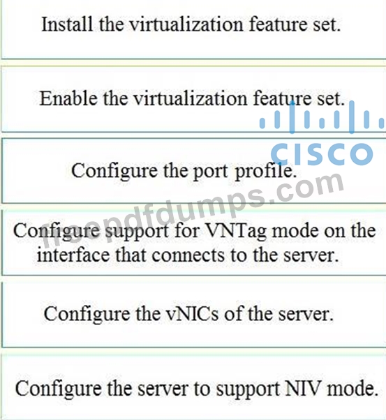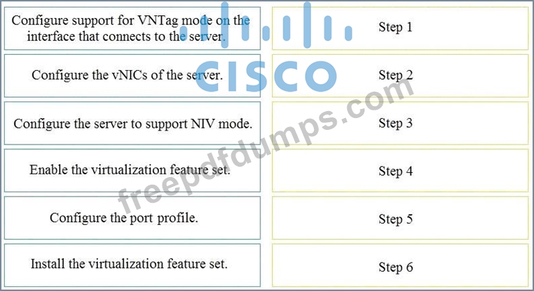 An engineer is configuring VNTag between a virtualized server and a Cisco Nexus 5500 Series switch. Drag and drop the configuration steps from the left into the correct order on the right.