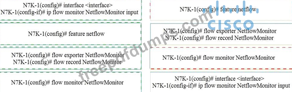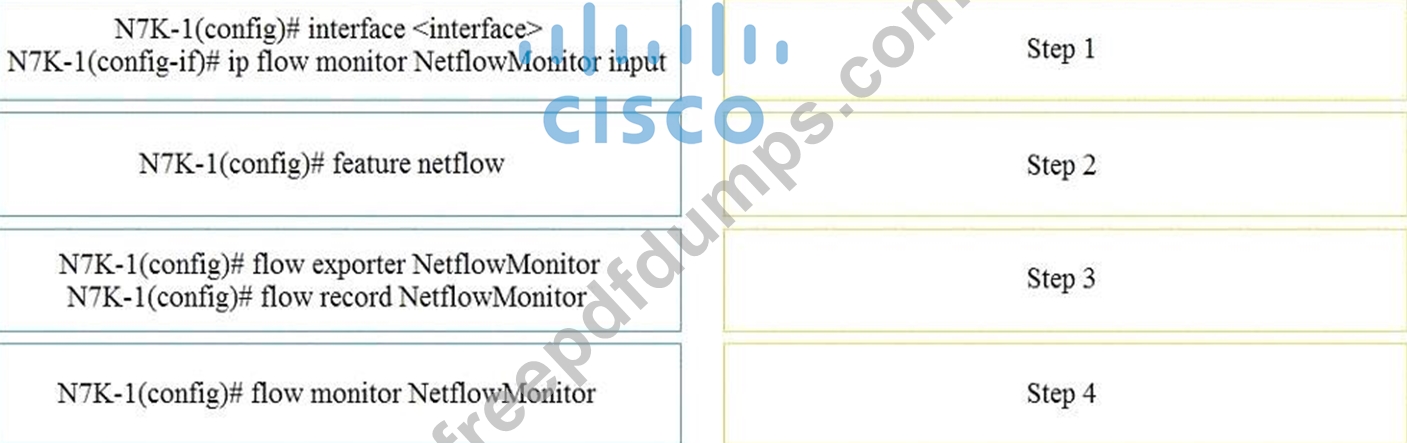 An engineer is implementing NetFlow on a Cisco Nexus 7000 Series Switch. Drag and drop the NetFlow commands from the left into the correct order they must be entered on the right.