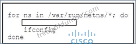 An engineer must create a Bash script to run in the Cisco NX-OS Guest Shell. The script must loop through the available namespaces and output all registered interfaces. Which code snippet completes the script?