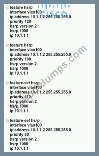An engineer must configure a Nexus 7000 series switch for HSRP on VLAN 100. When fully functional, the router must be the active master. Which set of commands must be used to implement the scenario?