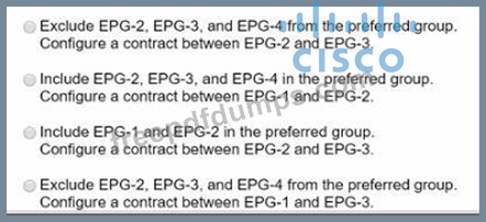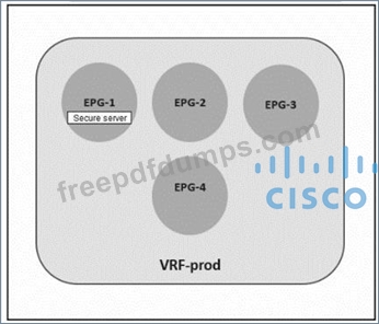 Refer to the exhibit. A secure server that provides services to EPG-2 must be placed in EPG-1. The remaining EPGs-EPG-2, EPG-3. and EPG-4-must communicate without any contracts. Which set of actions accomplishes this goal?