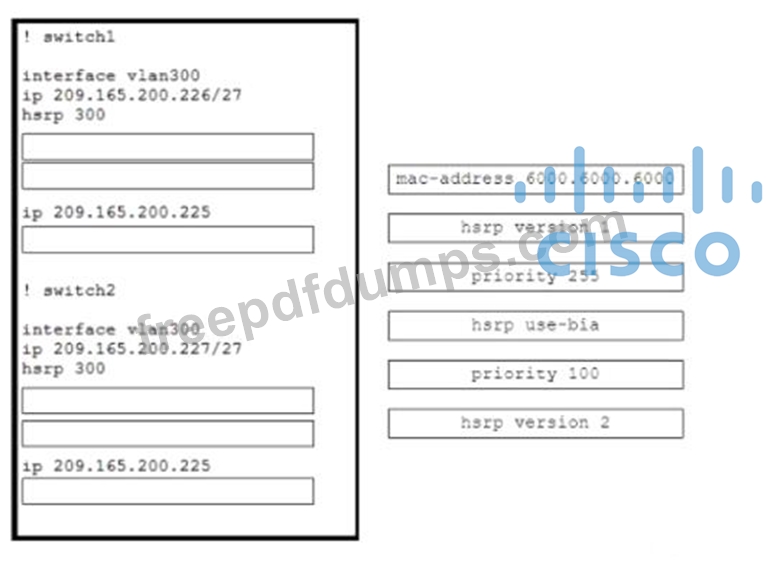 Drag and drop the commands from the right to complete a configuration of the HSRP on the left. The commands are used more than once. Not all commands are used.