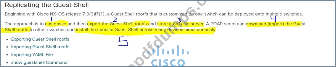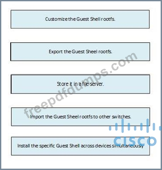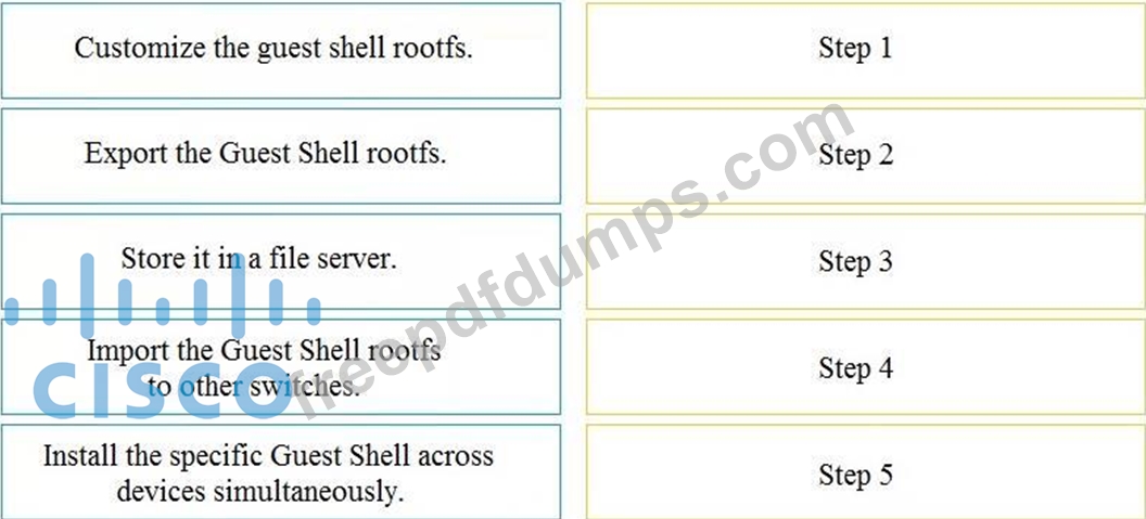 An engineer deploys a custom guest shell rootfs onto multiple switches. Drag and drop the steps from the left into the correct order on the right.
