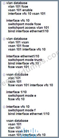 A storage array must be connected to port ethernet1/10 on a Cisco MDS 9000 Series Switch In addition, the array must connect using the FCoE protocol and be single-homed Which configuration meets these requirements?